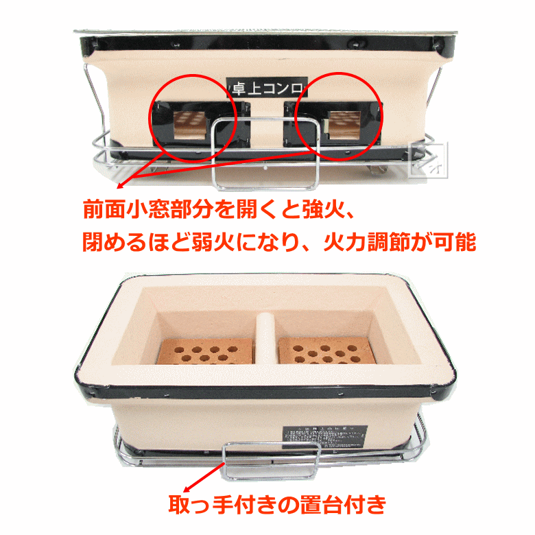 商 品 説 明 サイズ 本体:(約)幅41×奥行24×高さ17cm セット内容 コンロ本体 1台・角アミ 1枚・目皿 2枚・置台 1台・火ハサミ 1本 使用できる燃料 木炭・オガタン・豆炭 ご使用方法 画像にてご確認ください。